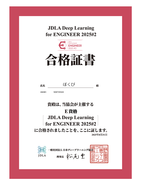 現在AIに関連する資格としては、下記を保持しています。現状では積極的にこれらを拡充していく予定はなく、どちらかと言うと実践方向に振っていきたいと考えています。その過程で体系的に学びたい内容が出てきたら、資格試験勉強を活用するかもしれません。