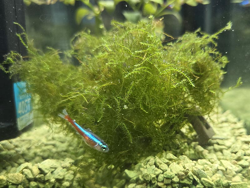 そしてカージナルテトラも1匹落ちてしまいました。以前からヒレがボロボロで気にはなっていたのですが、動きに気になる部分はなかったのでそれほど気にしていませんでした。しかしウィローモスと水槽の間に挟まってじっとしている姿を見つけた時には既にだいぶ衰弱している様子で、回復は無理だと悟りました。そして1日経たずに落ちてしまいました。