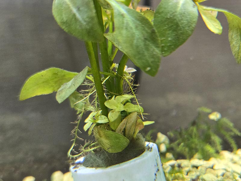 ルドヴィジアレペンスに生えていた苔はほぼなくなりました。上部にある葉っぱは苔のせいか、そもそも水上葉だったのか、だいぶボロボロになってしまいましたが、下部にある幹からはたくさんの若葉や根っこが生えてきていました。