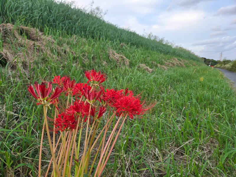 利根運河の手前まで走ります。南風でしたので往路は風に乗って楽々進みます。対向してくる人たちは一様にペダルが重そうで、帰りの気が重いです。土手に目を遣ると、彼岸花が咲いていました。10株くらいが点在している形で一面の花畑という場所はないのですが、CRから見るとそれらが全部繋がって見えます。
