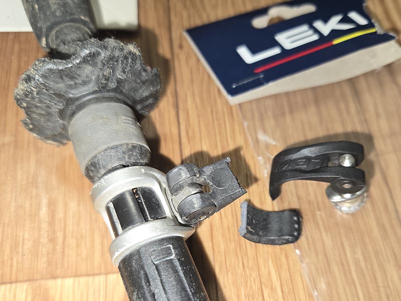 先日の間ノ岳北岳縦走の際に、ポールの長さを調整しようとロックを解除したら、レバー部分がやけに抵抗なく開いておかしいなと思ったら、レバーが折れてました。このトレッキングポールは6年弱前に購入しています。プラスチック製で長いこと使っているので経年劣化による部分も大きいと思いますが、一方で強くロックしすぎてレバーの開閉時に負荷が掛かっていた面もあるかと思います。