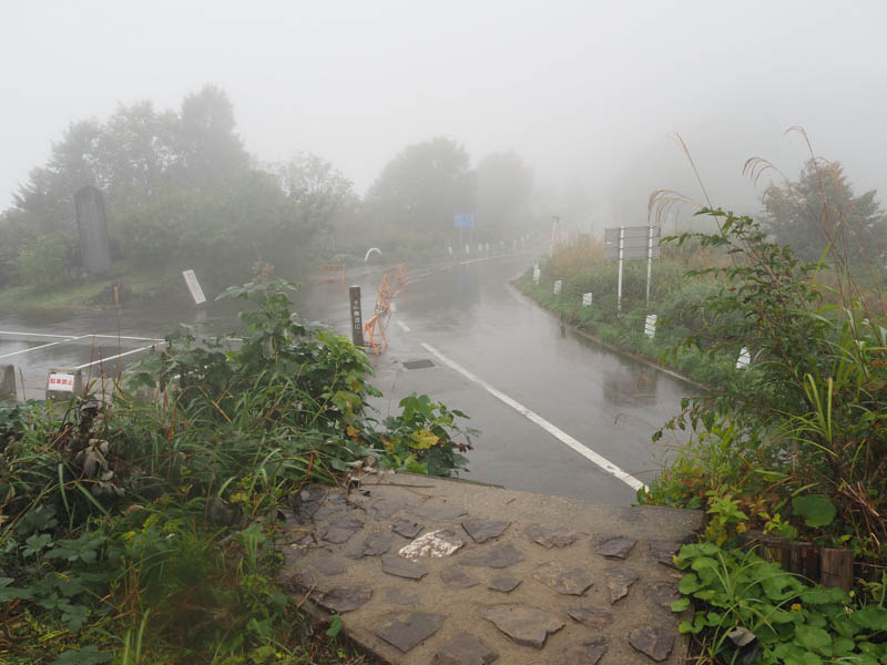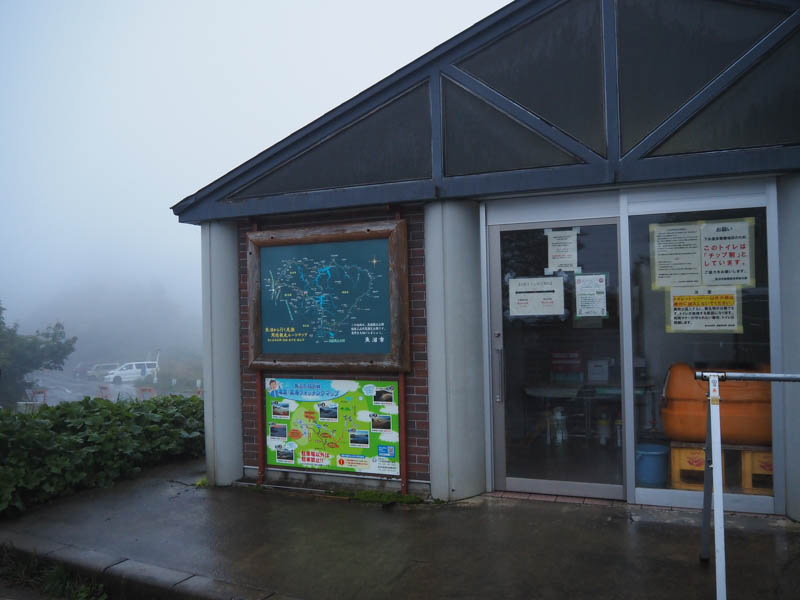 5時に宿まで迎えにきてもらいます。外は霧雨でしたので予めレインウェアを着ておきました。タクシーに乗車したら枝折峠まで向かいます。利用したのは小出タクシーさんで、時間貸しの9,500円となりました。峠道を走っていき、5時30分手前に枝折峠に到着です。なお駒の湯登山口なら徒歩でのアクセスも可能ですが、合流時にルートを覗いてみると枝折峠登山口のルートよりは歩きにくそうな印象でした。獲得標高も増えますし、初めてなら枝折峠登山口が無難なのかなと思います。
