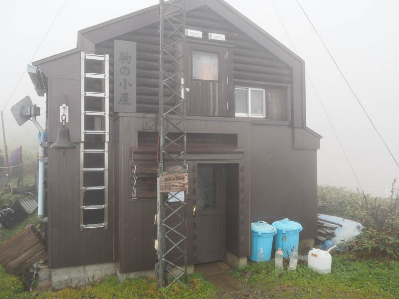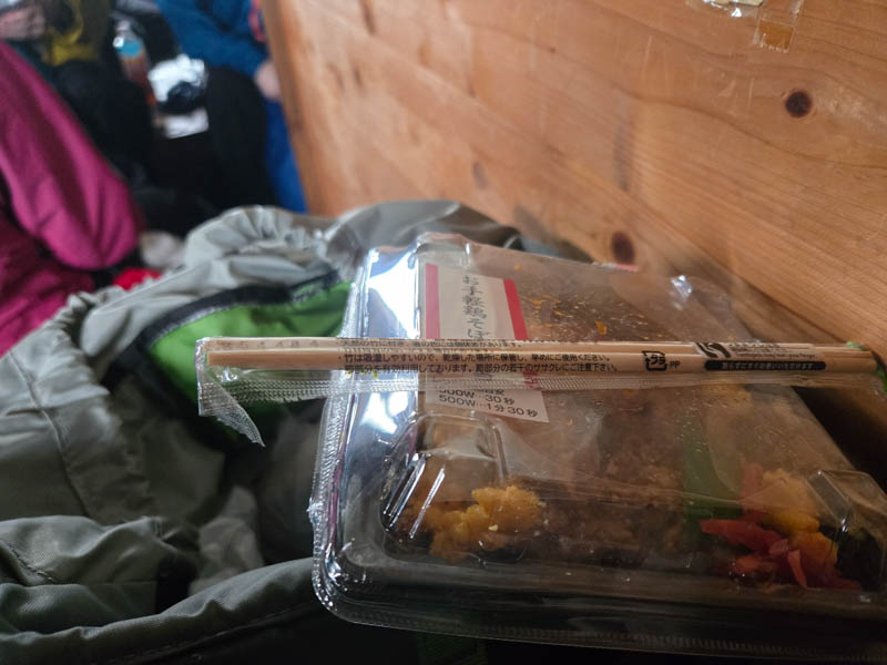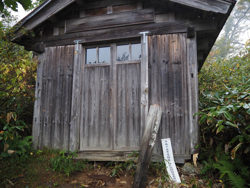 展望もないし多少の寒さもあるので、早々に避難小屋まで下りました。避難小屋でも先の団体と重なったので混みあいましたが、ここで昼食をいただきました。雨天山行で屋根のある場所はとてもありがたいです。