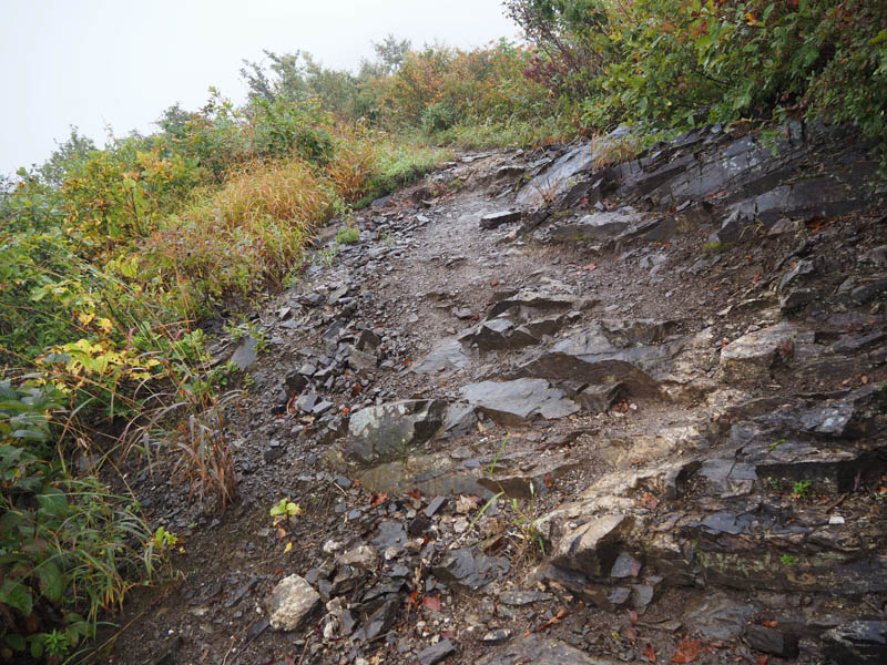 やがて道行山との分岐に出合いました。ここは真っ直ぐ進み、小倉山へ向けて登っていきます。急坂区間は短いと書きましたが、急なところはかなり急で、岩に沿って60度くらいの勾配を登っていく箇所もあります。急な段差は適宜足場を見つけて登っていく必要があります。それほど体力は必要としませんが、基本的な登山スキルがないとやや大変でもあります。枝折峠からの登山道はほぼ低木に囲われて、背の高い木々に囲われる樹林帯はほとんどありません。今回はガスでしたが、晴れていたらとても眺めが良いんだろうな、と思いました。