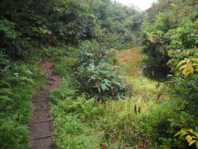途中から湿原地帯に入ります。広大な湿原ではなく小さな湿原になりますが、登山道の脇にも幾つか池塘が点在しています。