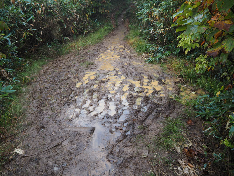 天気は回復しないままですが、日が高くなった分多少明るくなった気がします。黙々と歩き続けて、小倉山には12時ごろ着きました。ちょうどこの前後に雨が強まり本降りとなります。ただ土砂降りとなることはなく、再びしとしと雨となりました。