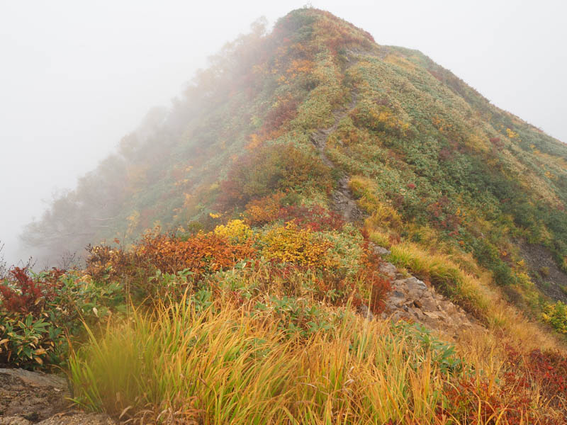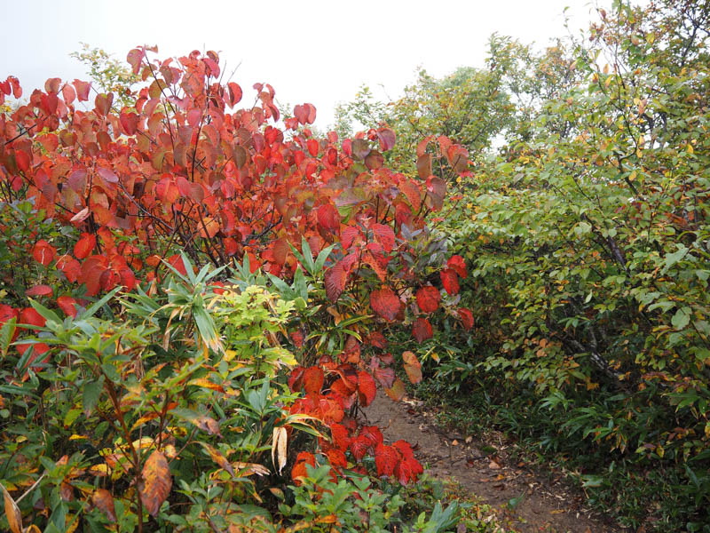その後は粛々と下山します。岩場のところもスタンスがしっかりしているので、予想していたほど下りにくさはありませんでした。急坂は少ないので膝に優しい下りです。時折ある登り返しは疲れますが、さほど長くないので頑張れます。ガスの中でも草紅葉や灌木の紅葉は鮮やかで、楽しめました。