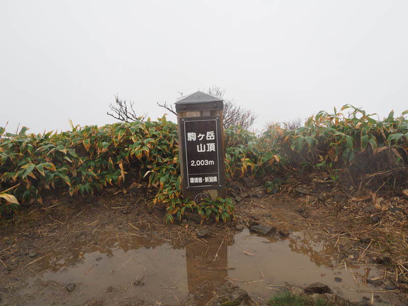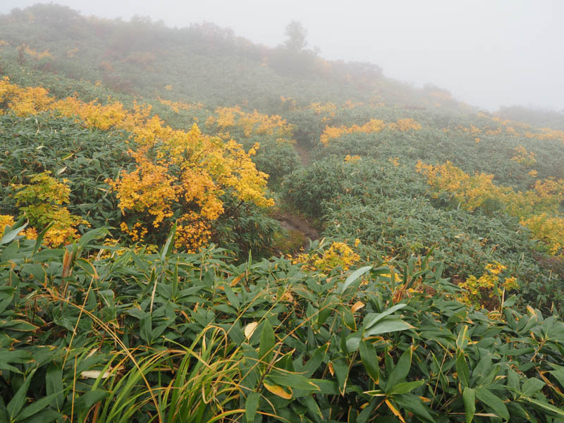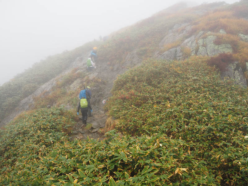 その後も粛々と進んでいきます。雨模様ですが、しとしと雨なのでそこまできつくはありません。ただガスで展望が殆ど得られないのは残念です。登山道脇にある近くの紅葉を楽しみますが、低いところはまだ鮮やかではないですね。