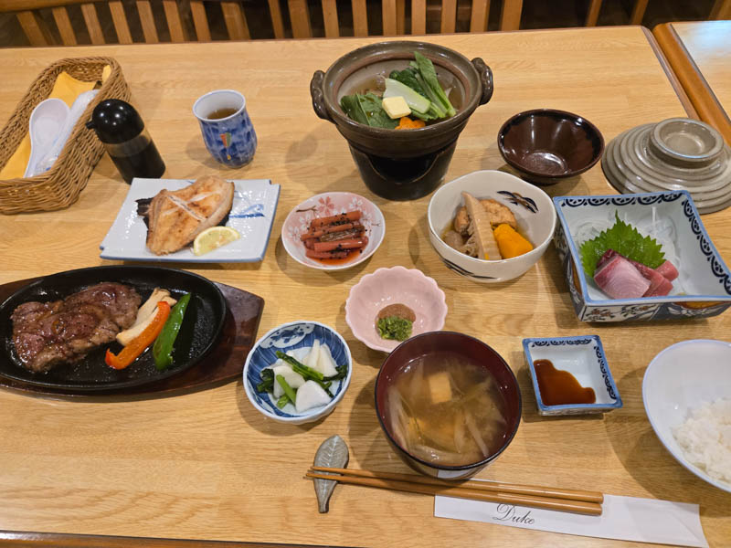部屋でしばらく寛ぎ、それから夕食をいただきます。鍋物、煮物、お造り、焼き魚など多くの品数を味わいます。さらにこちらの名物である鉄板ステーキも堪能しました。ご飯もお代わりして翌日の山行に向けてエネルギーを蓄えます。お酒は飲まないでおきました。