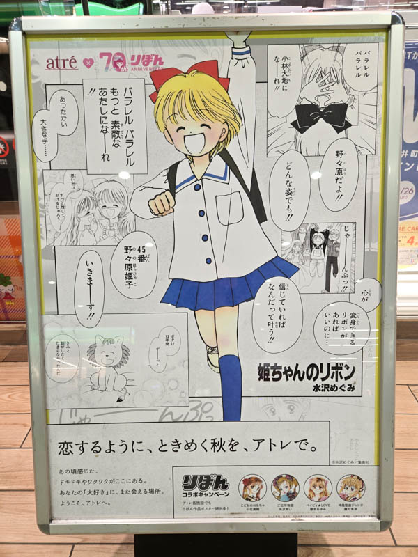 自分の最寄り駅である川崎も本イベントのラッピングがされており、毎日通勤時に見ることができます。令和の世でこれらの作品を街中で見られるとは思いませんでしたね。まさにアトレ秋のびっくり大増刊号でした。時間があれば、久しぶりに「姫ちゃんのリボン」全巻通読してみたくなりました。
