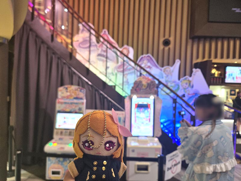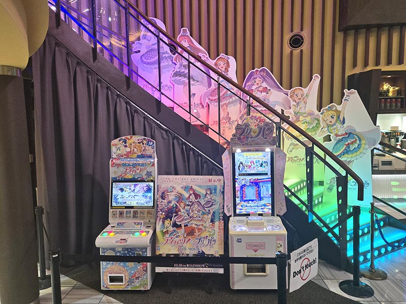 新宿バルト9ということで、例のロビーの階段もアイカツ!×プリパラ仕様となっていました。段上にはそらみルミナスの6名のキャラクターパネルが立っています。そして階段の手前には、アイカツ!とプリパラの筐体が笑っちゃうくらい近くに並んでいます。せっかくなので、あかりさんのおすわりボールチェーンマスコットと記念撮影です。