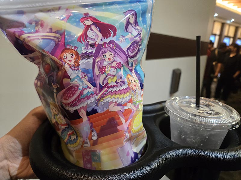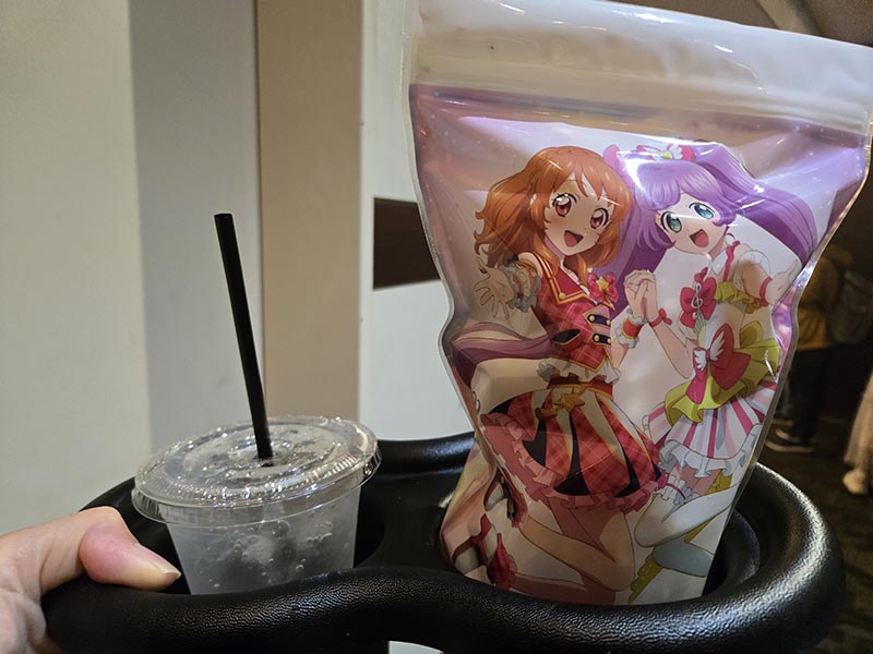 そしてコラボフードも販売していたので、購入しました。オリジナルポップコーンバッグと出会いのキセキ!ドリンクです。ドリンクの内容は、パステルピンクジュレ+ピーチシロップ+ソーダになります。オリジナルポップコーンバッグはキービジュアルが前後にプリントされたものになります。それぞれ特典も無事ゲットです。他の物販については、この日は時間がなかったこともあって購入していません。