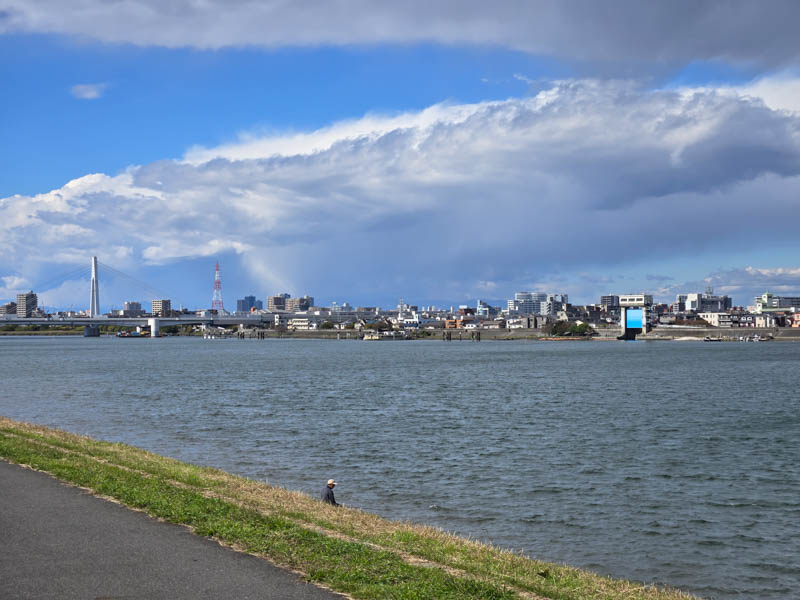 その後は来た道を戻ります。この日は西風が強く吹いており、戻りは向かい風となる修行区間です。そして天気予報の通り少し雲が増えてきました。大師橋まで戻ったら川沿いのサイクリングロードを下ります。