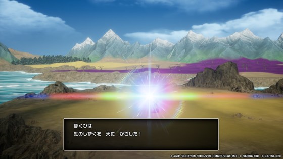 こうしてせいなるまもりを入手し、それがロトのまもりへと変化したので、聖なるほこらへ向かいます。虹のしずくを入手したら、リムルダール西の岬へ趣き、魔の島へレインボーブリッジを架けました。この際に竜王サイドのシーンが差し込まれますが、竜王のさらに上、というか傍で暗躍している存在がいることが示唆されます。うーん、気になる。さて、この後はいよいよ竜王戦となります。