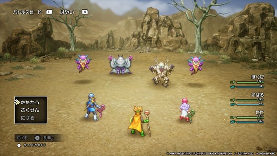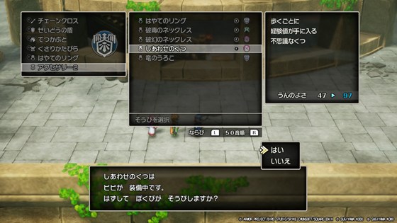 そしてダウンロード予約特典によって、種としあわせのくつをゲットしました。しあわせのくつによる経験値稼ぎは、特にレベルが低い頃は恩恵が大きいですね。以前の版に比べて、町やフィールドのサイズに対して一歩の距離が短くなっており、さらにダッシュ移動があるのでかなり効率が良いです。ある程度レベルが上がると当然しあわせのくつだけでレベルアップを図るのは厳しくなりますが、3人の成長速度を調整するのに役立てています。基本的に3人とも同じレベルにしたいので。