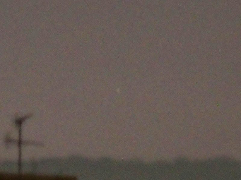 前回の反省を活かして、レンズは12-100mmの悪魔のレンズです。日没後40分くらいでまだ市民薄明ですが、既にだいぶ彗星の高度が低いのでこの時間から狙います。この明るさだとカメラのライブモニタでは全く星が見えませんね。そこでStarWalk2のARを活用してみました。これだと高度が分かりやすくて良いです。アプリで大まかな位置を捉えて、カメラの広角端で撮影し、拡大再生しながらレモン彗星を探します。するとそれらしき淡い光を捉えることができました。出来れば周囲の星の並びで確実に照合したかったのですが、如何せん空が明るすぎて駄目です。