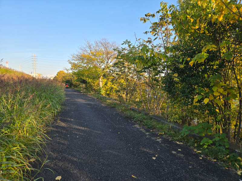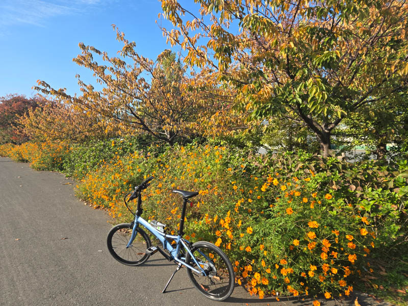 2025年11月15日、気持ちの良い秋晴れでしたので、折り畳み自転車で走ってきました。前回は多摩川沿いでしたので今回は鶴見川沿いを走ります。鶴見川に入る手前、路地に見事な紅葉があったので、立ち寄って撮影してみました。そのまま路地を走って鶴見川へ向かいます。ここで後方確認をしようとしたら、バックミラーを忘れたことに気づきました。サイクルリュックに入れておかないと駄目ですね。