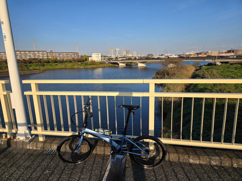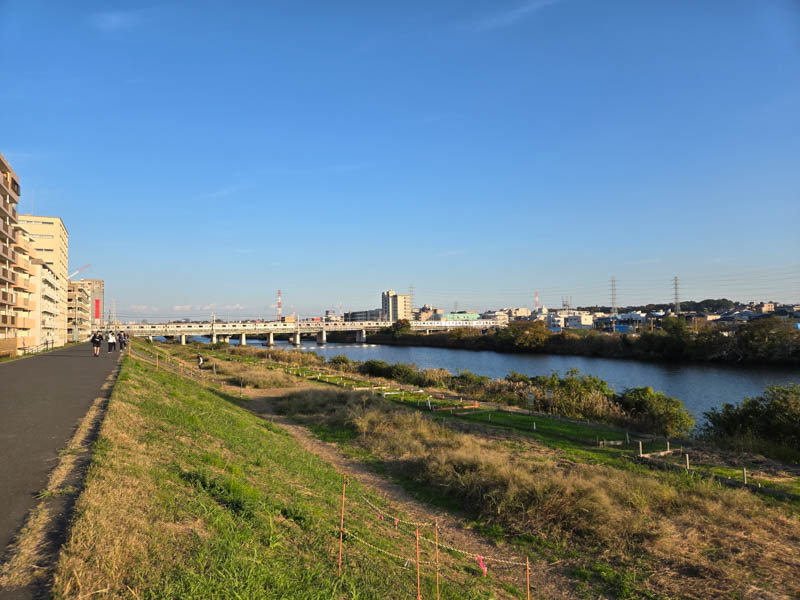 東急東横線の橋梁を望めるところで小休止します。青空が広がる好天で、サイクリング日和ですね。この辺は初めて訪れたので、下道におりて散策したい気持ちもありましたが、この日はレモン彗星チャレンジのため早めに帰ります。