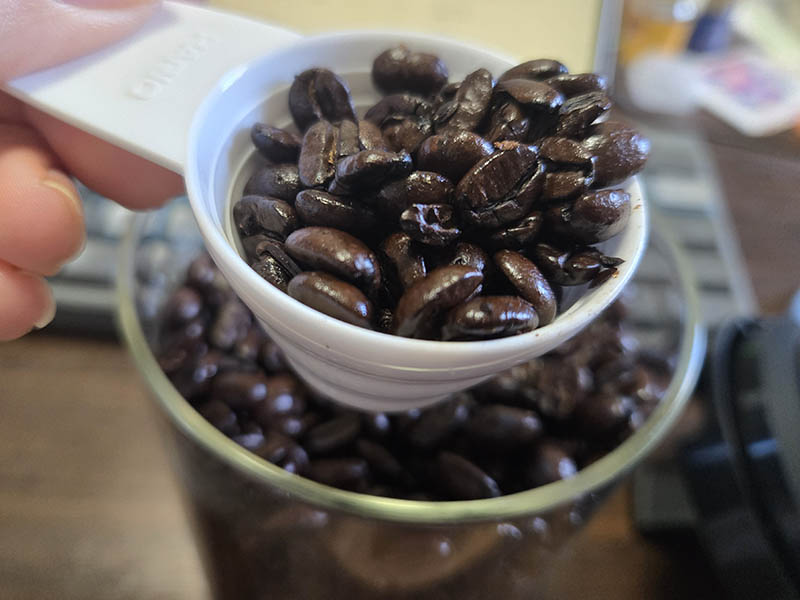 前回のブラジルは中煎りですが、こちらは深煎りになります。見た目もだいぶ焦げ茶色をしていますね。長い時間を掛けて焙煎していることにより、豆の内部の組織が脆くなっており、弱い力でもサクサクと挽けます。また水分が抜けているので、計量カップで同じ嵩であっても、挽いた後の量は多くなります。