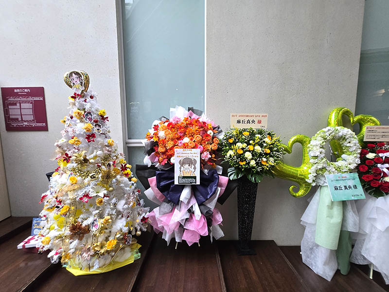 大学のキャンパス内のホールということもあってか、若干動線が特殊です。階段の途中でチケット確認があり、その後階段に沿ってフラスタが並びます。途中にホール入口があり、そこを過ぎて上まで登ると、グッズ物販コーナーやCD販売コーナーがあります。さらに奥に進むと、フラワーバスケットの展示があります。