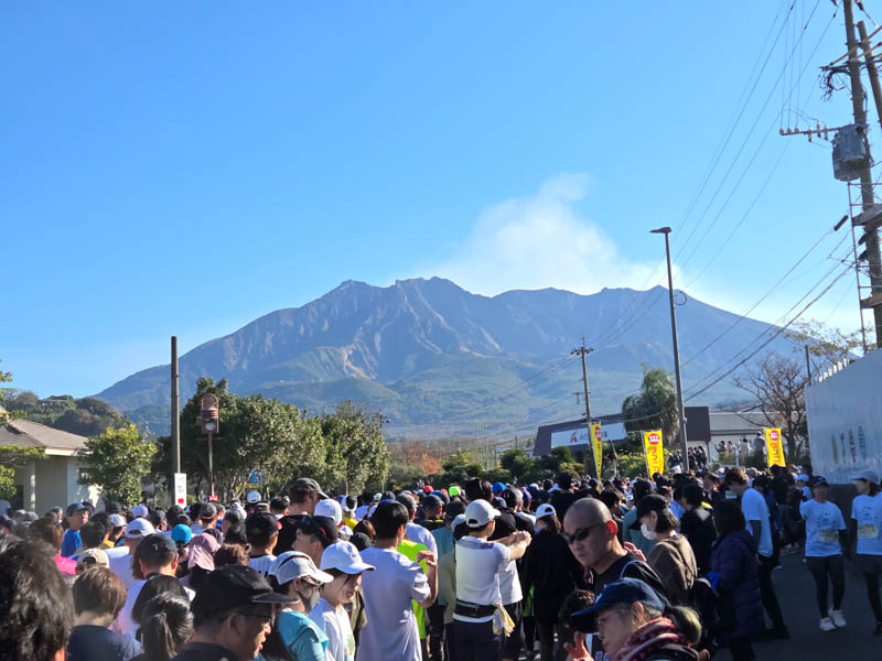 鹿児島港の桜島フェリー乗り場に近いホテルで前泊し、8時40分発のフェリーで桜島に移動します。短い時間ですが船旅を楽しめます。桜島に到着した後は人の流れに沿ってスタート会場まで歩きました。ゆっくり歩いて10分間くらいです。必要なものは事前に郵送されているので、当日の会場受付は不要です。なお、せっかくなのでTシャツも注文済です。