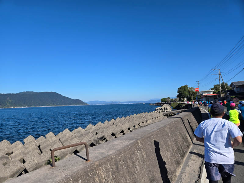 列が動き始めて少し経ったらスタートの号砲が響きました。しばらくは団子状態なので、ゆっくり進みます。フェリー乗り場を過ぎたら、海沿いの道を走っていきます。好天なので空の青と海の青がとても目映くて、気持ちの良い景色が広がります。海の向こうには本土が見えます。