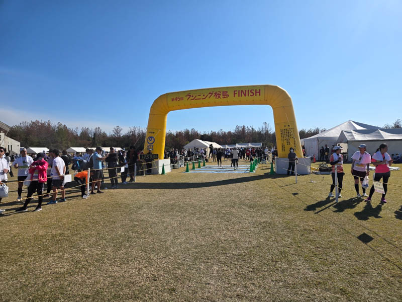 脚力や息はまだ多少余裕のある感じでしたので、減速は悔しいですね。バナナ3個は食べ過ぎだったかな。そんな中早歩きで頑張っていたら、左脚が攣りそうな気配を見せてきたので、あまり荷重せずに走ります。そしてようやくゴール広場に入り、ゴールゲートが見えてきたので、最後のひと踏んばりでゴールしました。