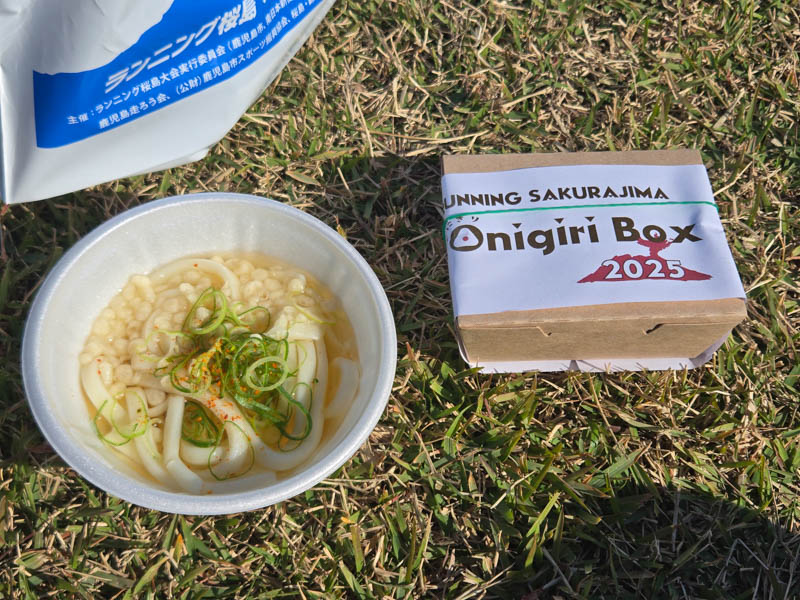 完走後はフィニッシャータオルとおにぎりボックス、うどん引換券、みかんジュース、ペットボトルドリンクを貰えます。芝生の上でしばらく休憩して、食事で英気を養いました。