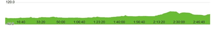 今回の計測データは以下の通りです。計測開始が少し遅れてしまったので、走行時間等が短くなっています。まあ、概ね普段のハーフマラソンと同じ結果ですね。3時間は切れたので良かったです。風もなく空も晴れて絶好のランニング日和であったことが幸いしたようです。