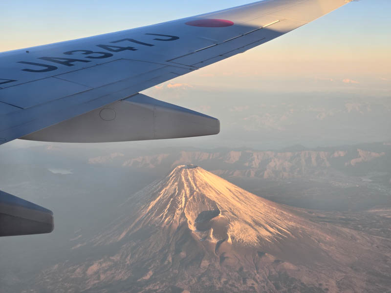 1日目、4時ごろ起きて5時前に自宅を出発し、羽田空港へ向かいます。さすがにサクララウンジに寄っている時間がないので、6時25分発の飛行機にそのまま搭乗しました。朝焼けに染まる富士山を見下ろしつつ、南へ向かいます。