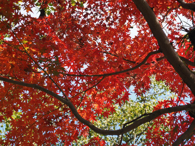 見学を終えたら外へ出ます。青空が広がる好天でとても気持ちが良いです。この後は慈眼寺公園を散策するため、川沿いの道へ下ります。川沿いに遊歩道が続いているのですが、夏の台風の影響で途中通行止めになっています。ちょうどもみじ谷が不通区間となってしまうのですが、その手前にある桜広場で色鮮やかな紅葉を楽しむことができました。