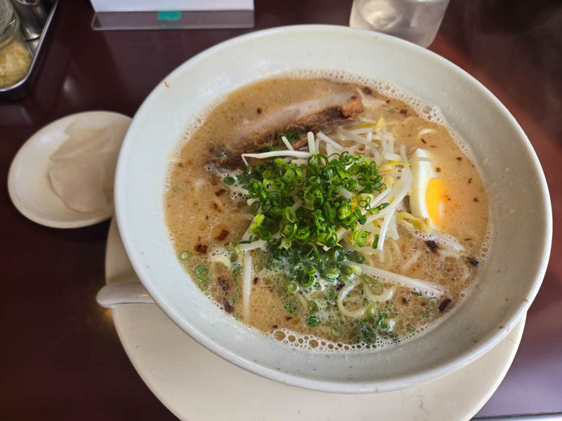 その後はじげんじ通りを真っ直ぐ進んで、えびすラーメンに入店し昼食をいただきます。注文したのはラーメンと餃子です。あっさり豚骨スープで、柔らかチャーシューにシャキシャキもやし、美味しく鹿児島ラーメンを堪能しました。