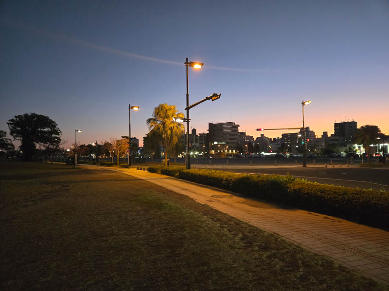 夕暮れが迫る中、天文館方面へ歩きます。若干距離はありますが、バスを使わなくても歩ける程度の距離です。20分くらい歩いて本日の宿であるアクアガーデン福丸に到着し、チェックインを済ませました。