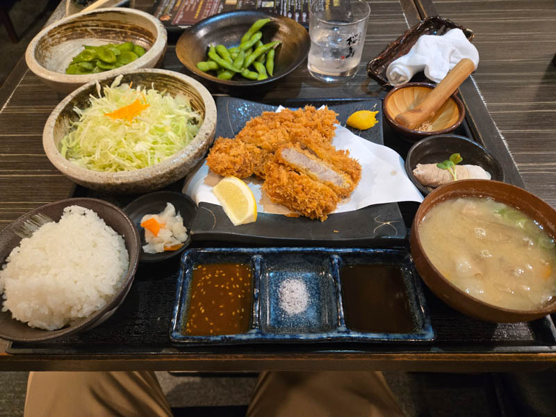 その後は黒かつ亭黒べぇへ行き、夕食をいただきます。注文したのは、黒かつ亭定食(ロースとヒレ)とわさび枝豆と黒桜島ロックです。たっぷり肉を食べて明日への英気を養います。明日はハーフマラソンですが、せっかく鹿児島の来たので焼酎は外せません。