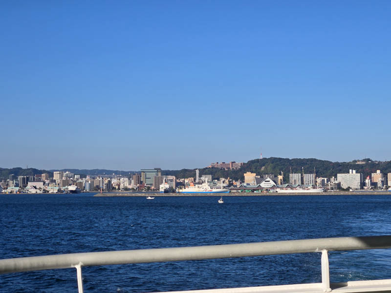 2日目、6時ごろ起きて、8時ごろホテルをチェックアウトし、歩いて桜島フェリーターミナルまで移動します。マラソン大会ということで混んでおり、当初予定の便より1便後に乗船しました。15分間の束の間の航海を楽しみます。やや霞んでいますが、南の方には開聞岳も見えました。