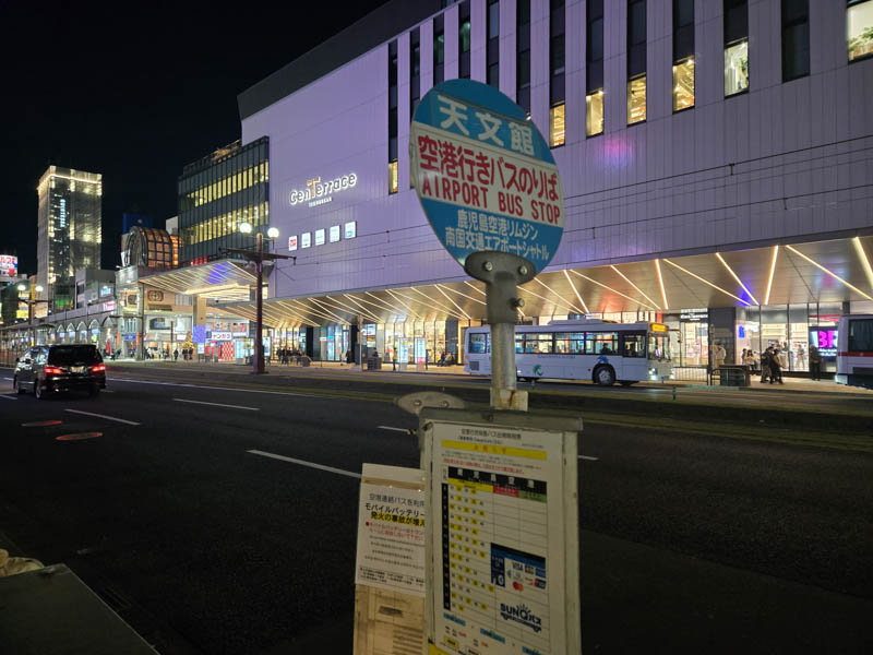 水族館を退館したらすっかり夜になっていました。ここから歩いて天文館まで移動し、空港行きのバスに乗ります。天文館はバス停が多くて、目的のバス停を探すのに少し苦労しました。