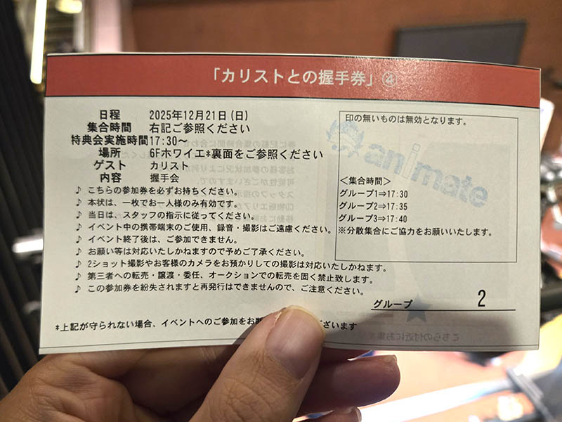 まるでスーパーヒーローのイベントのようなタイトルです。遅い時間に物販のCDコーナーにいったので、握手券は貰えないかな、と思っていたら、上記の通り貰えたので参加してきました。グループ1の集合時間が開場と同時刻なのは、なかなかハードです。自分はグループ2で開場から5分後でしたが、それでも早い時間から入場列に並んでギリギリでした。列形成は開場10分前くらいから始まります。開場から開演まで30分しかないので、集合時間の早さは仕方ない部分はありますけど、忙しないですねえ。