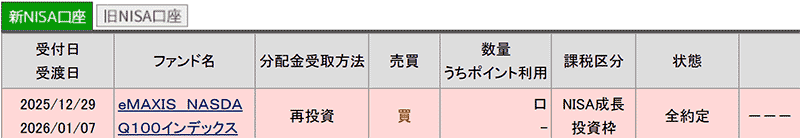 そしてこれを注文したのが2025年12月29日で、年内あと2営業日あるから今年のNISA枠で行けるだろ、と思っていたら、取引日が12月30日で受渡日(決済日)が翌1月7日となってしまいました。2025年のNISA枠を使えず、2026年のNISA枠を半分弱使う形になり、何とももったいないことをしてしまいました。