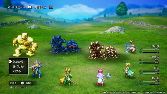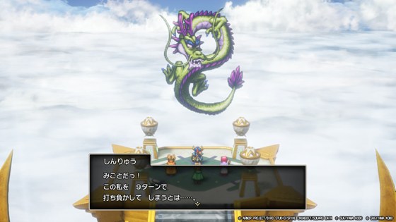まずはしんりゅうを倒して願いを叶えてもらいます。レベル99なので余裕で勝利できますが、雑に戦うと15ターン以内撃破が出来ずに願いを叶えて貰えません。ターン数を消化してしまう原因が、バフを上手く使えないことなので、行動順に注意しました。しんりゅうはいてつく波動でバフ解除をしてくるので、味方攻撃→味方バフ→いてつく波動というパターンに嵌ると、常にバフなしの攻撃となり、ターン効率が著しく悪化します。そこで、攻撃役はバフ役の味方よりすばやさを一回り落とせるように、ほしふるうでわ等で調整しました。基本的に全員しんりゅうよりは速いので、これでだいぶ安定して15ターン以内撃破ができるようになりました。