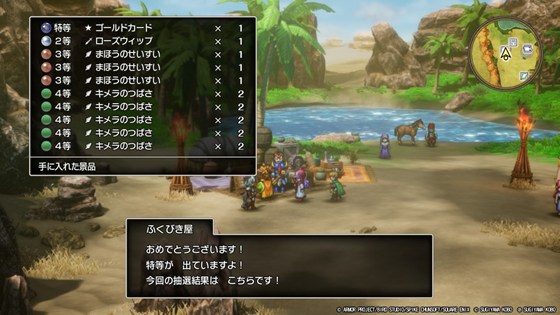 ふくびき自体は運ゲーなので、とにかくたくさんのふくびきけんを集める必要があります。ふくびきけんの入手方法は幾つかありますが、クリア後であればアルメハで1枚777Gで購入可能です。これを少しでも安く購入するために、オアシスのふくびき屋の特等であるゴールドカードを狙います。何度か回して、無事ゲットしました。これでふくびきけんを20%割引で購入できます。