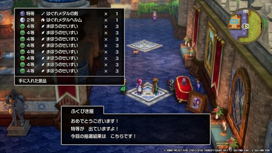 この後は、ゼニスの城のふくびき屋でひたすらリセマラです。ここの特等はなかなか出ませんね。ふくびきけんを大量に購入したとはいえ、1回に3枚必要なのですぐに底をついてしまいます。リセマラに伴うタイトル画面からぼうけんのしょの読み込みまではそれなりに時間を使うので、試行回数を増やすためにふくびきけんの枚数は多いほど効率が良いです。そしてついに特等が出て、はぐれメタルの剣を入手出来ました。それなりに時間が掛かりましたが、はかぶさの剣に比べたら可愛すぎるもんです。