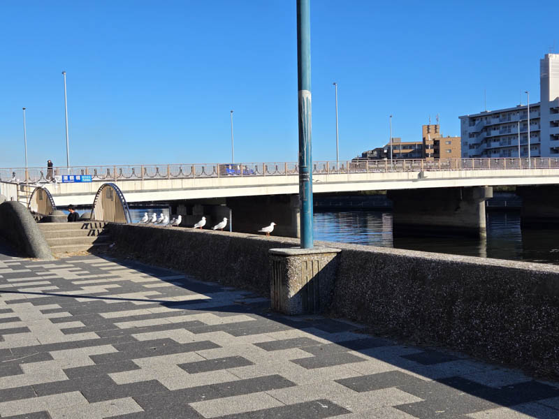 やがて潮鶴橋に出合います。ここはすぐ近くに信号つきの交差点があるのですが、横断歩道が川沿いの先の道に上手く繋がっておらず、きちんと横断歩道を渡るとやや大回りを強いられます。2回ほど信号待ちをして、ようやく潮鶴橋の袂へ戻って来られました。