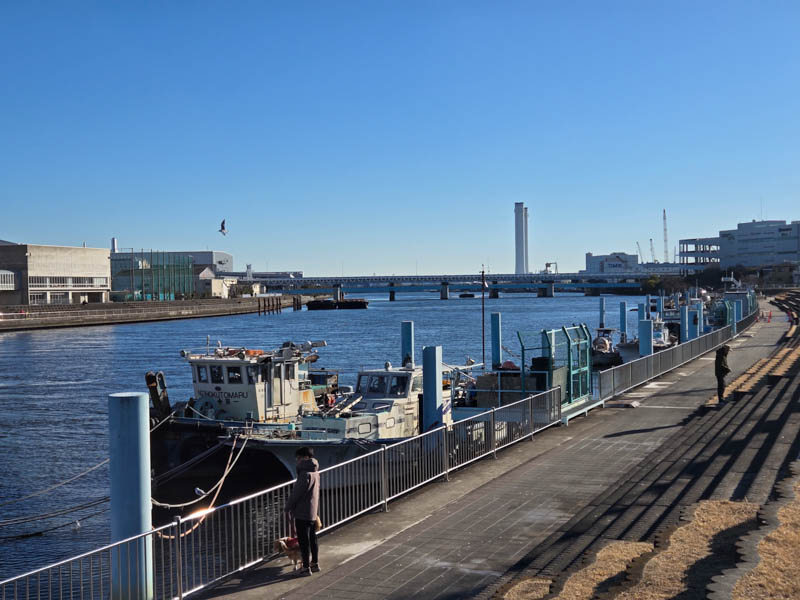 その後は細い一般道を少し走り、再び川沿いの道に入ります。臨港鶴見川橋を越えたら、いよいよ海も間近です。川岸を見ると接岸している船舶の数が増えてきました。