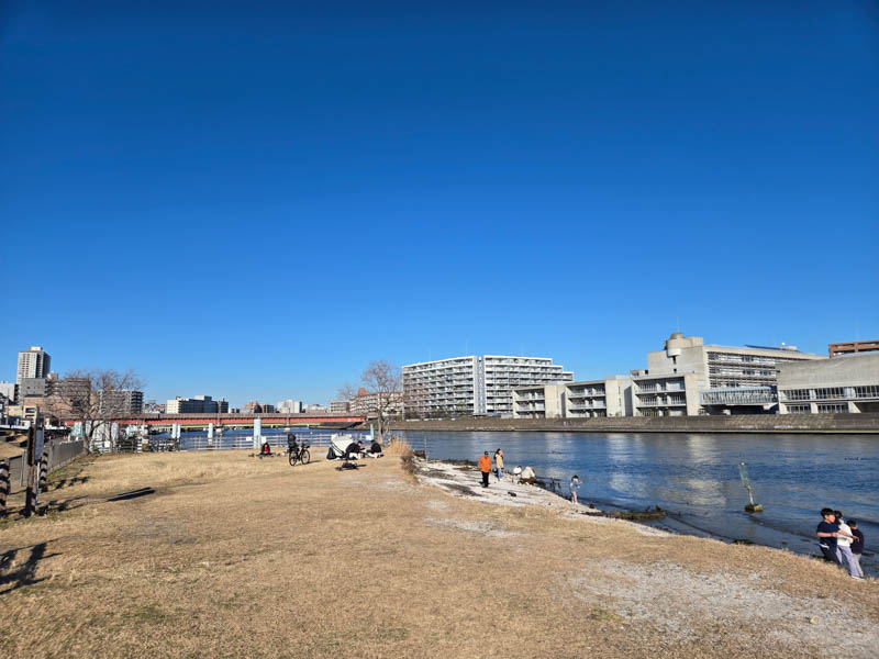 程なくして本日の目的地である鶴見川河口干潟に着きました。干潟自体はあまり広さがありませんが、カニなどの生き物が見られるようで、子供たちが水辺で生き物観察などをして遊んでいました。干潟以外は特段何があるわけでもないので、河口の景色をのんびりと楽しみます。天気が良いので、ぼーっとしているだけでも気持ちいいですね。