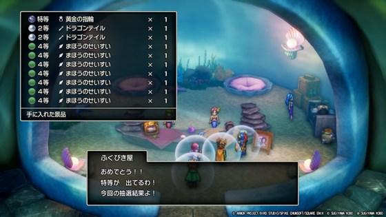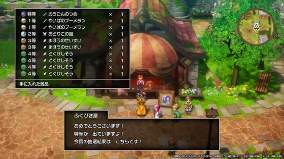 続いては、ふくびき屋のアイテムを回収します。主に特等の景品が未入手です。アルメハでふくびきけんを100~200枚購入して、各ふくびき屋でリセマラを繰り返しました。ここは完全に運なので、わりとすぐに特等が出ることもあれば、そこそこ粘ったこともありました。それでも1時間以内には入手できる程度の確率です。