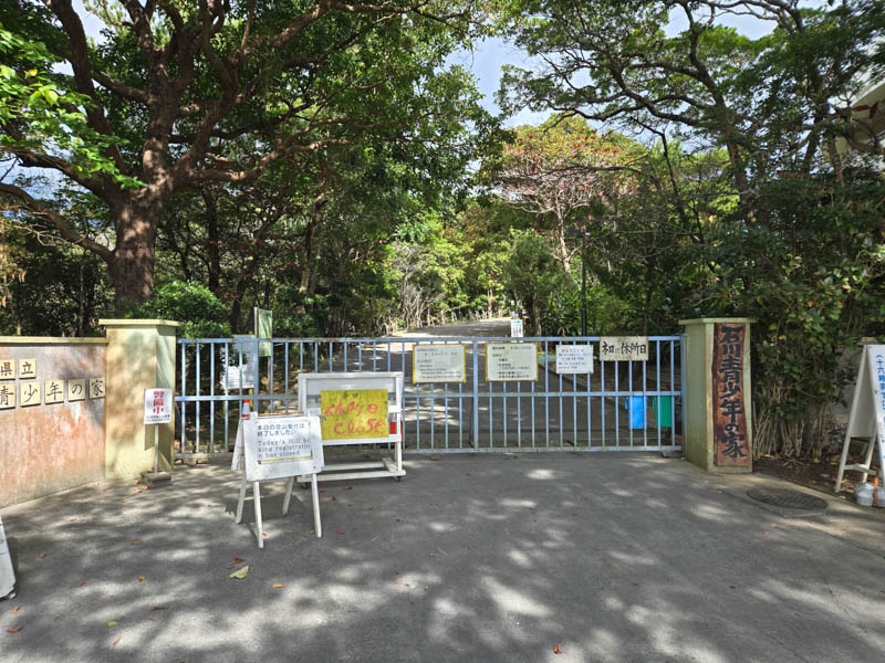 旭橋バスターミナルから高速バスで石川ICまで移動します。大体1時間程度ですね。そこから歩いて石川少年自然の家に向かいます。しばらく幹線沿いを歩き、そこから脇道に入って舗装路を登っていきます。天気予報に反して日が差しており、少し暑いです。若干汗ばみつつ石川少年自然の家に着いたら、ゲートが閉まっています。嫌な予感を覚えつつ進んでいくと、休所日の文字がありました。うそーん、月曜はお休み。