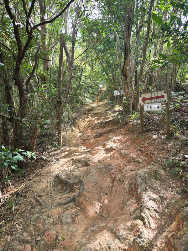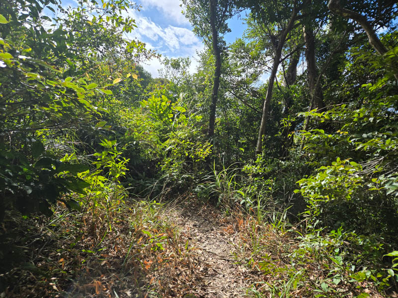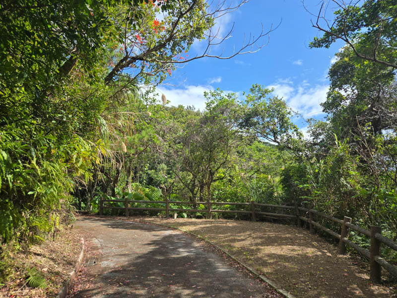 園内の地図の看板はボロボロでほとんど読めませんが、遊歩道を真っ直ぐ進んでいくと、山道が現れます。道はよく整備されており、登りやすいです。急登はあるものの大した距離はありません。ただ地面は粘土質なので、雨が降った後は気を付けた方が良さそうです。植生は南国を感じさせるものが目立ちます。