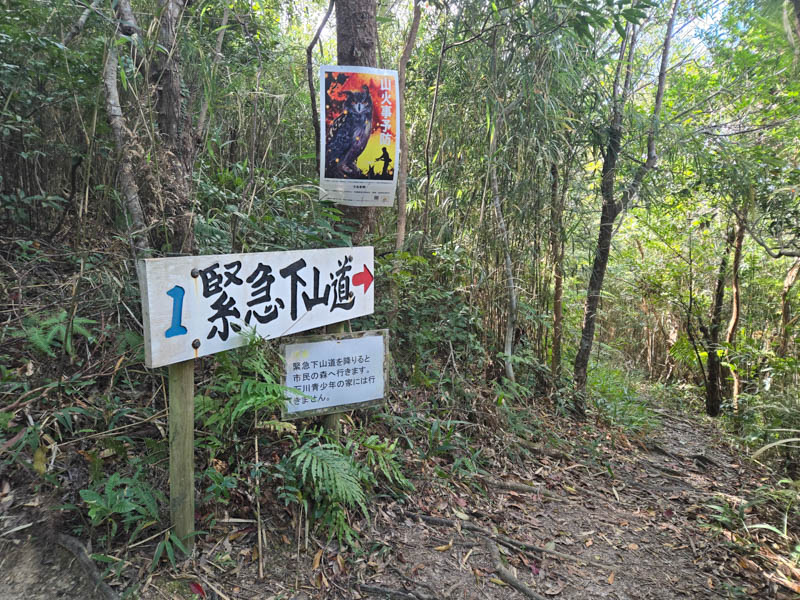 下って来た道を登り返して、緊急下山道1経由で下ります。このルートは整備されているものの、登りに使ったルートと比べると若干道が荒れ気味でした。下り終えて公園の遊歩道と合流するところにロープで立ち入り禁止となっていたので、基本は使わない想定のようです。