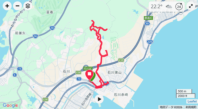 石川ICから測定開始しているので、登山だけではなく街中トレッキングも含んでいます。高度グラフは山頂で休憩中に、気圧の変化か、差異が大きく出て段差のようになってしまいました。