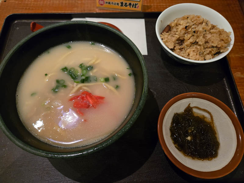 向かった先は交差点の向かいにある、まるそばです。注文したのは、まるそばとジューシーともずくのセット、焼き餃子になります。鶏白湯スープの沖縄そばで、美味しくいただきました。